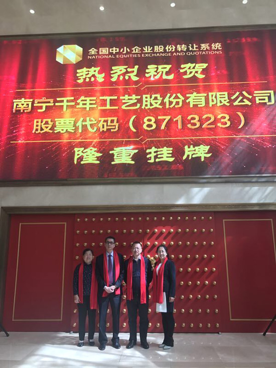 2017年5月5日,在北京金融街金陽大廈內(nèi),隨著開市寶鐘的敲響,南寧千年工藝股份有限公司(企業(yè)簡稱:千年工藝,股份代碼:871323)在全國中小企業(yè)股份轉(zhuǎn)讓系統(tǒng)成功掛牌上市,成為廣西首家正式登陸新三板資本市場的工藝制造企業(yè),這是總公司在發(fā)展進(jìn)程中的一個(gè)重大里程碑!
